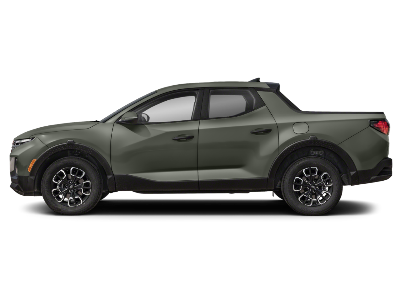 The 2025 Santa Cruz SEL features pronounced black wheel arch cladding and bold body-side sculpting with muscular haunches. The 18-inch black alloy wheels showcase a distinctive geometric design. The vehicle’s profile maintains a unique blend of SUV and pickup elements, with a rakish C-pillar leading into a short truck bed. The dark finish and black trim create a cohesive, sporty appearance.